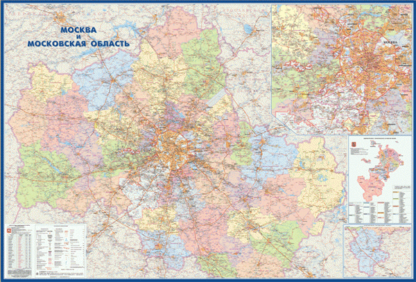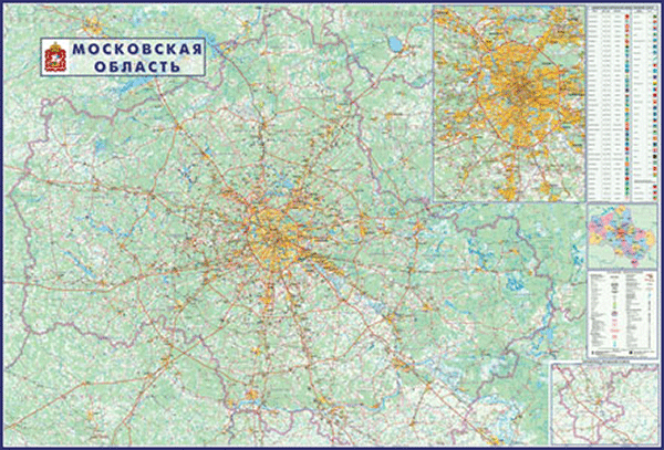Границы районов Московской области, их названия и центры. Все населенные пункты, подробная дорожная сеть, охотничьи и рыболовные базы, памятники архитектуры, места отдыха. Цветом выделены леса и дачные участки. На врезке дана более подробная карта Москвы и окрестностей, схема административного деления Москвы и список районов Московской области