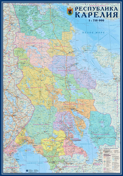 Показаны границы Республики Карелия, цветом выделены все административные районы Карелии, отмечены районные центры. Населённые пункты даны в соответствии с количеством жителей; указаны автомобильные дороги, их номера и технологическое состояние, железные дороги, расстояния между отдельными участками автодорог, элементы природы и рельефа. Показаны территории государственных заповедников, национальных парков и заказников федерального значения; отмечены речные и морские порты, аэропорты, международные автомобильные пункты пропуска, объекты культуры и сервиса, основные достопримечательности.