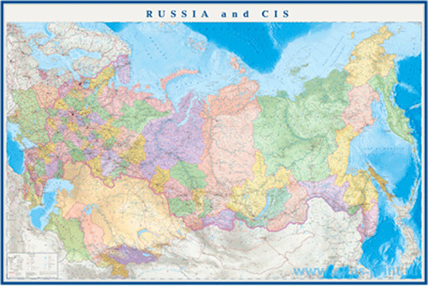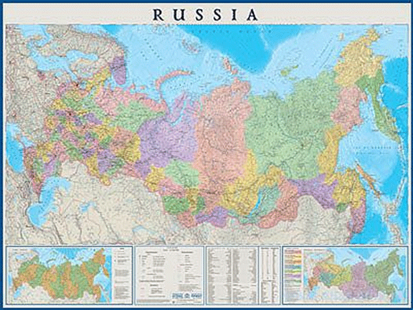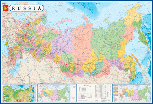 Настенная политико-административная карта России на английском языке. Мелованная бумага с ламинированием. Цветом выделены все субъекты Российской Федерации, подписаны их названия и центры. Цветным фоном показан рельеф суши и морского дна. Показаны и подписаны населенные пункты, порты и аэропорты, автомобильные и железнодорожные магистрали.