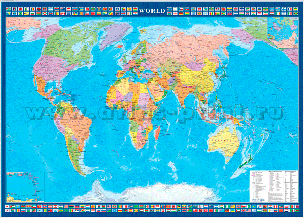 Настенная политическая карта Мира на английском языке World с флагами стран 1,43*1,02 м. Мелованная бумага с ламинированием. Цветом показаны все страны Мира, подписаны названия столиц.